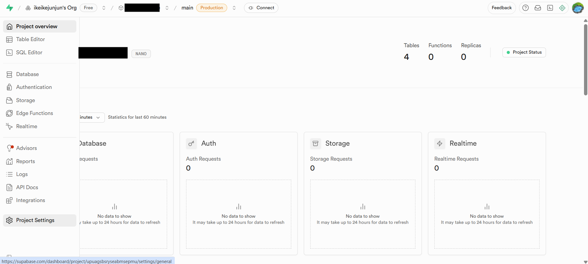 Supabaseの公式サイトでアカウント登録 → プロジェクトを作成。ここまでは完全にGUIで進められます。